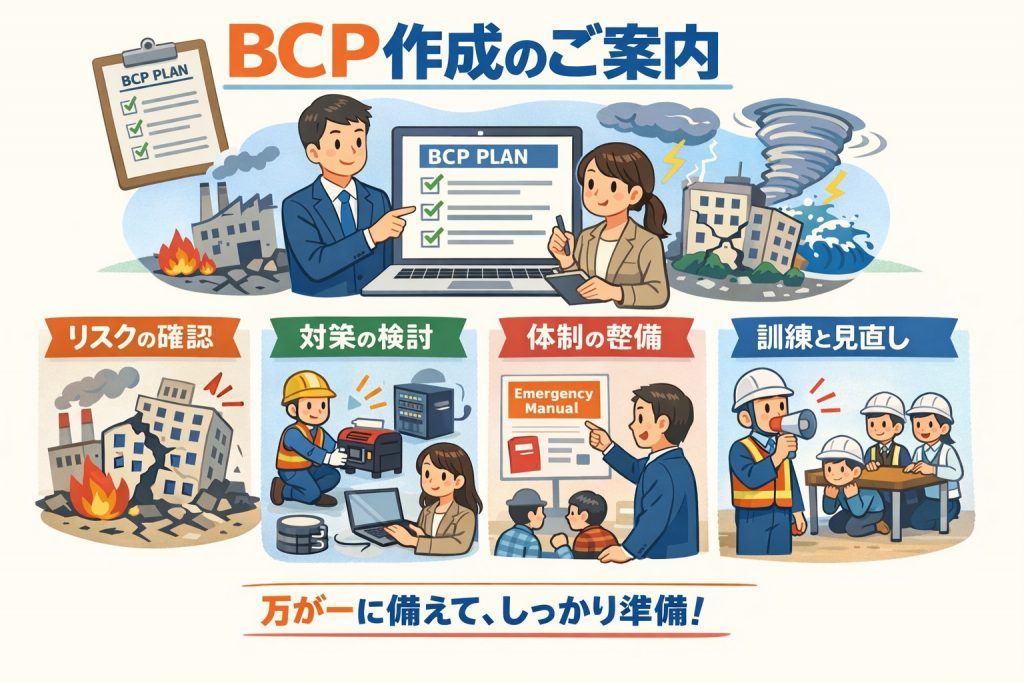 耳の痛い話をしましたが、当事務所ではBCPの作成をお客様に代わって行います。